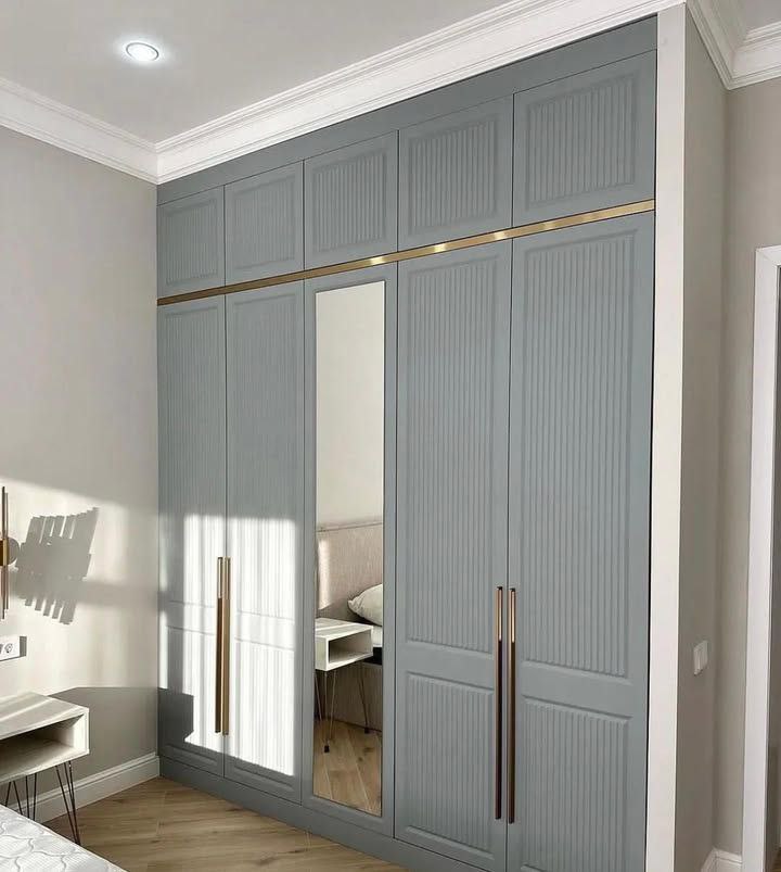- Зеркальным — визуально расширяет пространство, что особенно ценно для небольших спален, и заменяет необходимость в отдельном трюмо.